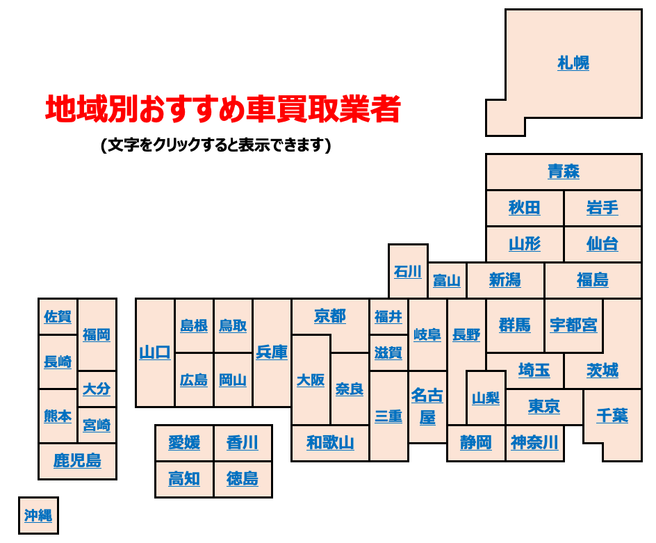 なお、当記事でご紹介している車買取業者は全て無料出張買取に対応していますが、店舗によって出張可能エリアは異なりますので、出張買取をご希望の方は下記の一覧で確認をしておきましょう↓↓